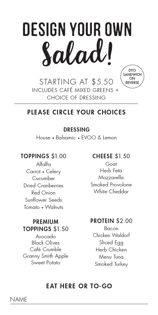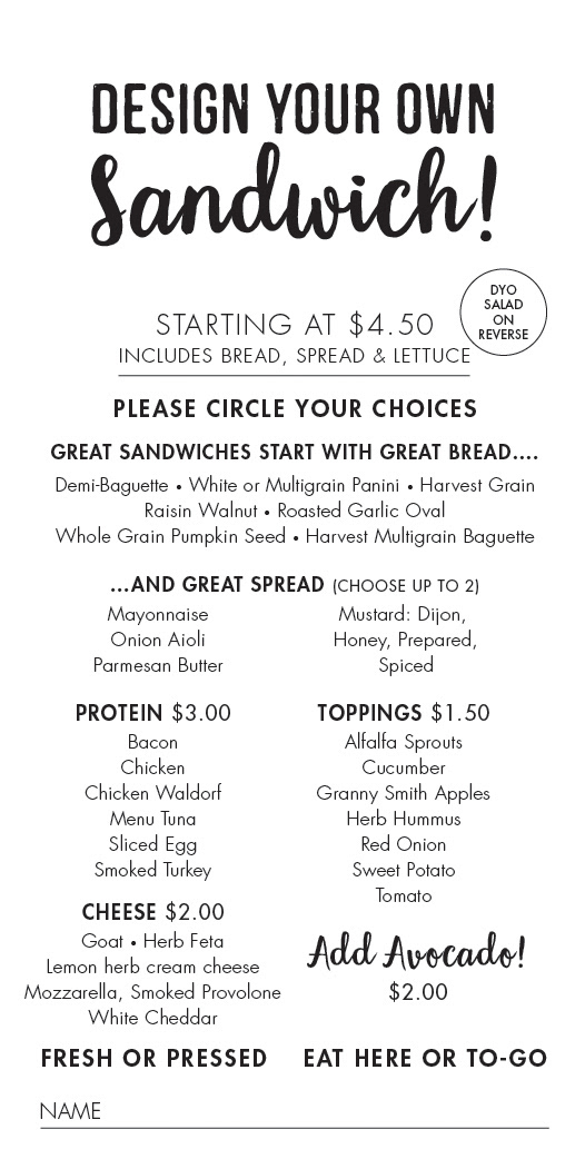 In Fall 2017 I was given the opportunity to re-brand the ACE Cafe. I was excited to bring the Cafe up to date with the rest of the Discover Great Bread brand. This includes large 36x48in Menu boards, and the Design Your Own order chits.