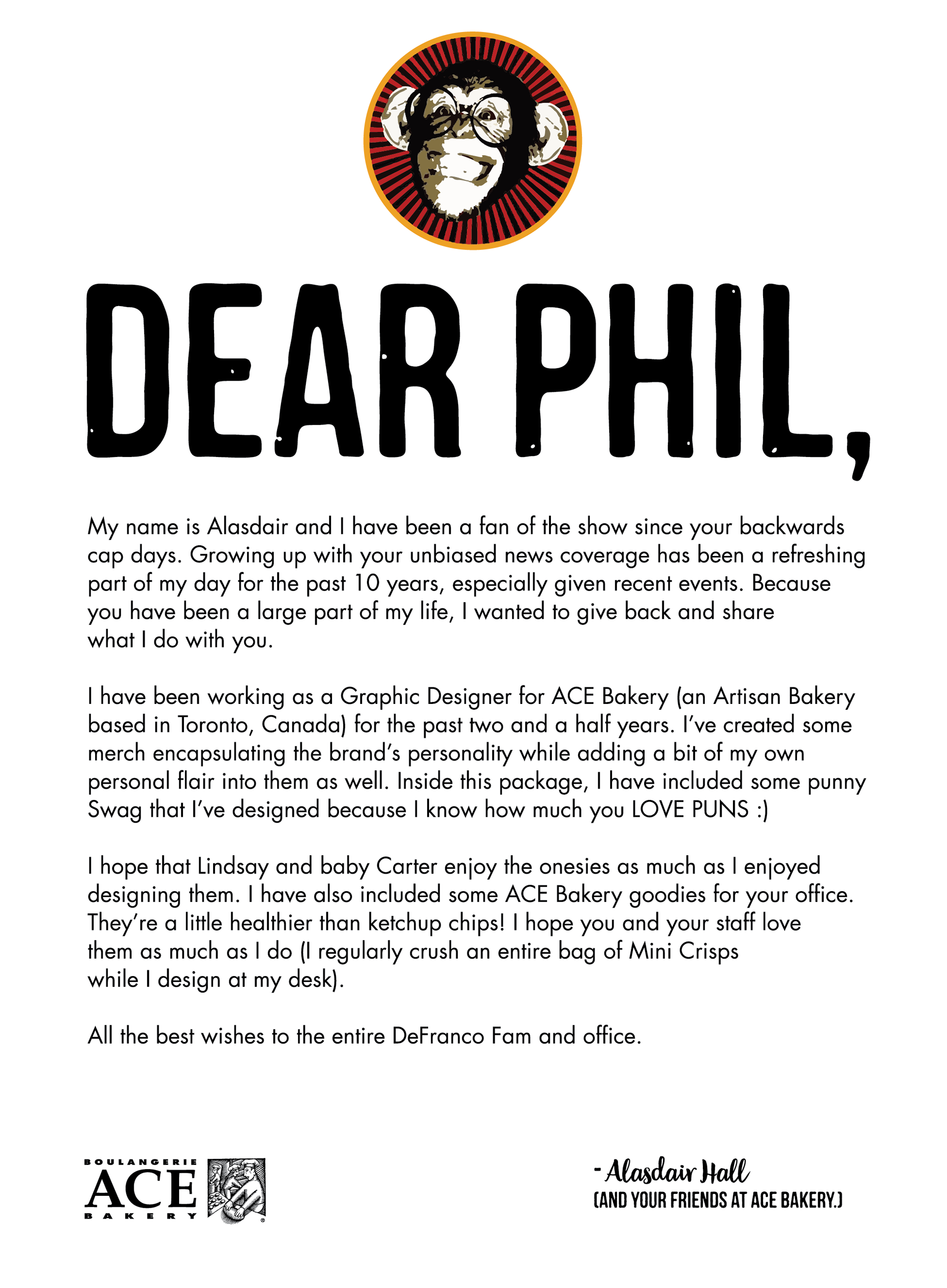 I had the idea to send a 'care package' to popular Youtuber Philip DeFranco. He has a News channel of 6M+ subscribers, and a secondary 'behind the scenes' channel where he opens fan mail. I got the green-light to send him a personalized letter along with ACE swag & products.