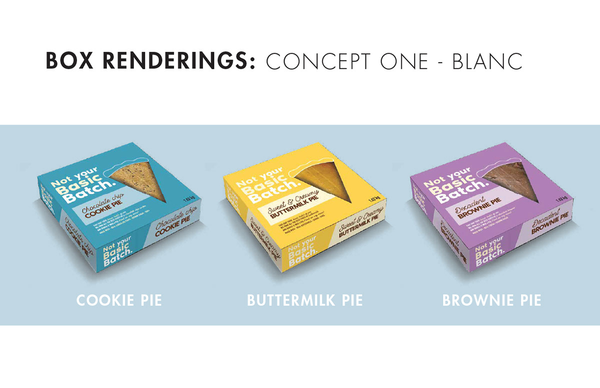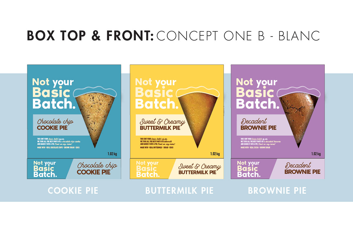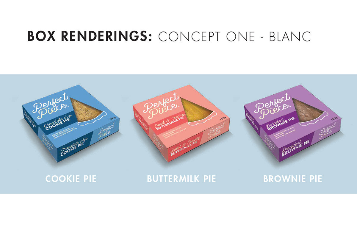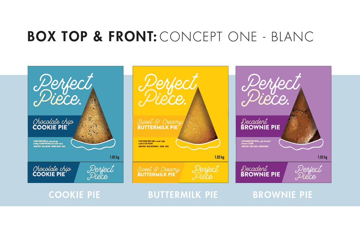 To achieve this, I developed three different design concepts. The first design is clean and minimalistic, featuring a window that showcases the pie slice. I paired it with two clever brand names, "Perfect Piece" and "Not Your Basic Batch," which are sure to resonate well with millennials.